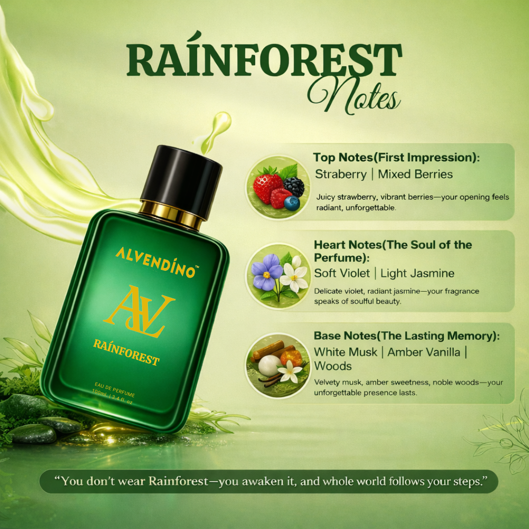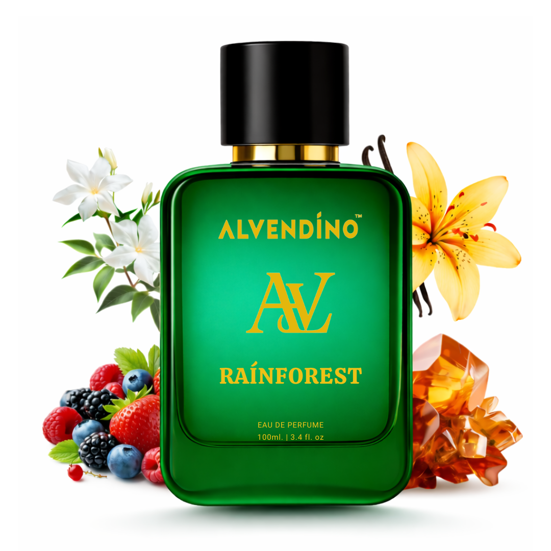 RAINFOREST by ALVENDINO is a rich, atmospheric fragrance that captures essence of misty woods and midnight rain - powerful, mysterious, and beautifully unisex. It opens with a deep earthy freshness, blending subtle spice and forest air, The heart reveals smooth leather tones balanced with soft floral warmth, creating harmony between strength and elegance. Finally, it settles into a base of amber, moss, and soft oud, leaving behind a smoky, luxurious trail that lingers on the skin.